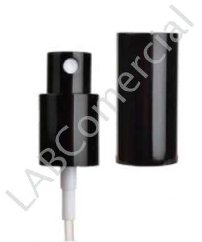 Black-plated atomizer spray cap for bottles with DIN18 or 18 mm screw thread, which is completed with a cylindrical protective cover of the same material and colour.