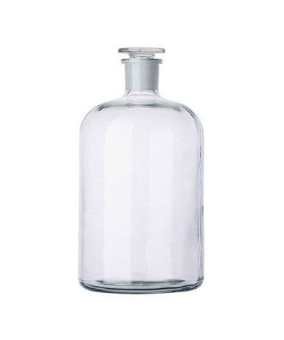 5,000 ml clear borosilicate glass bottle with narrow mouth and standard ground joint with glass stopper.