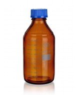 Laboratory reagent bottle made of light-protective borosilicate glass in accordance with ISO standards, featuring a Retrace Code for full traceability.
