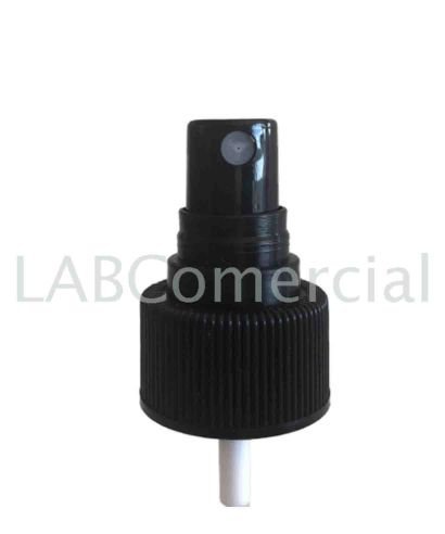 Tapa spray vaporizador negro para frascos con rosca 24 mm y se completa con una tapa protectora translúcida.