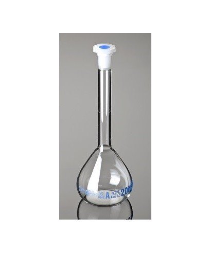 Le récipient volumétrique est doté d'un joint supérieur en verre rodé standard 24/29 avec un bouchon blanc en plastique polypropylène.