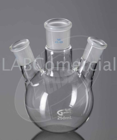 Ballon à fond rond d'une capacité de 250 ml avec 3 embouchures parallèles : joint standard en verre rodé femelle 29/32.